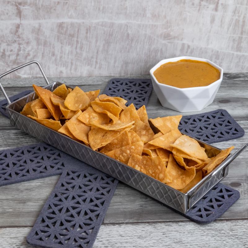 House Queso Cheese sauce, made from vegetable oil, pea protein, roasted tomatoes, green chilis, paprika, salt, yeast, chili & chipotle powder. comes with house made tortilla Chips.